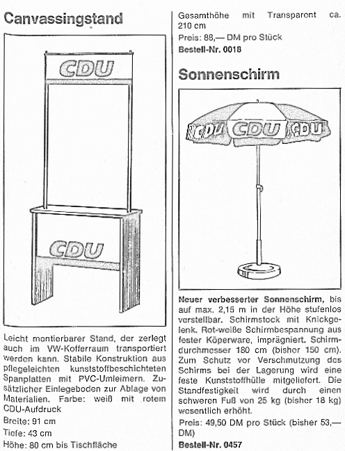 Wer übrigens – wie ich – den Begriff „Canvassing“ für neumodisches „Denglisch“ hält, kann sich in dieser Sammlung historischer Wahlkampfmaterialien aus dem Jahr 1976 (in der Helmut Kohl erstmalig gegen Helmut Schmidt antrat – und damals noch verlor) der unionsnahen Konrad Adenauer-Stiftung eines Besseren belehren lassen: Nicht nur wurde der Wahlkampf mit Infoständen auf der Straße bereits in den 70er Jahren als Canvassing bezeichnet, er fand auch schon mit nahezu unveränderten Tischchen, Schirmen und Giveaways statt. Ein Wahlkampf mit Tradition also, der in den nächsten zwei Wochen bis zur Wahl noch an vielen Straßenecken in Wernigerode zu erleben sein wird.
