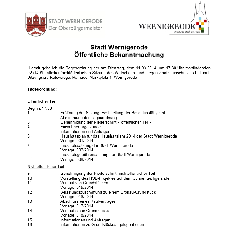 Zum Start des BLACK.blog Wernigerode im vergangenen Monat hatten wir versprochen, hier auch regelmäßig über interessante Themen aus den Ausschüssen sowie aus den Sitzungen des Stadtrats zu berichten, wobei sich unsere Kommentierung natürlich auf den öffentlichen Sitzungsteil beschränken muss. Diesem könnte theoretisch auch die Presse beiwohnen und über die Ergebnisse berichten – praktisch tut sie dies jedoch nur bei solchen Sitzungen, in denen Vorlagen von besonderem öffentlichen Interesse besprochen werden. Für öffentlich weniger bedeutsame aber nichtsdestotrotz für politisch begeisterte Wernigeröderinnen und Wernigeröder möglicherweise interessante Sitzungen wird es zukünftig daher ab und zu einen Kommentar in diesem Blog geben.