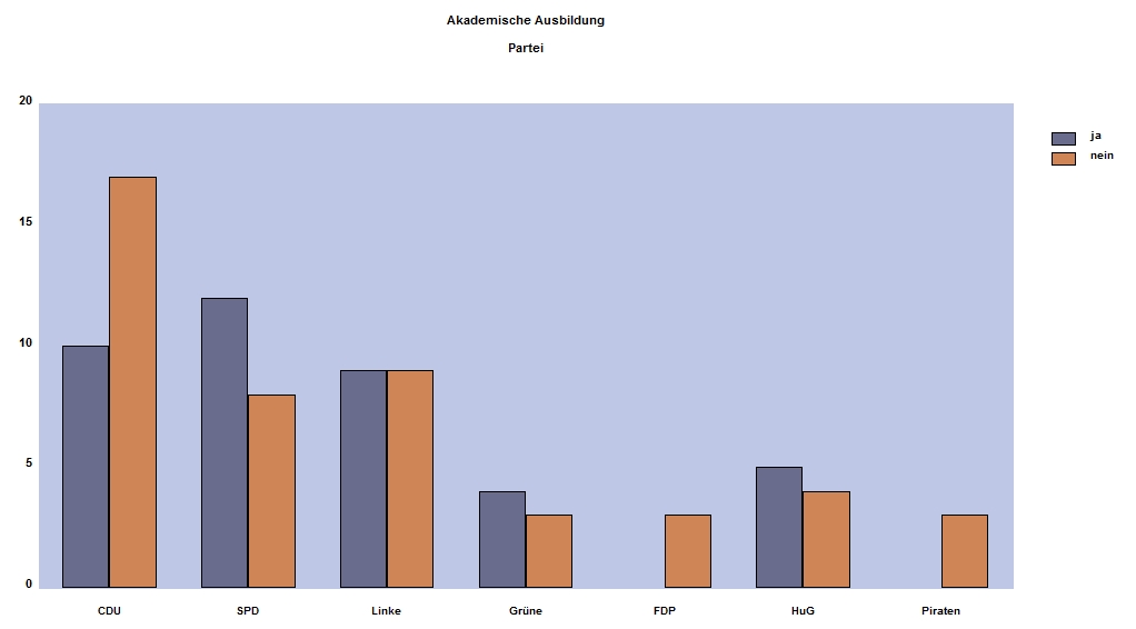 In der Tabelle findet sich darüber hinaus die Akademikerquote, d.h. der Anteil an Kandidatinnen und Kandidaten, die eine akademische Ausbildung durchlaufen haben. Die Angabe steht beispielhaft für eine ganze Reihe von möglichen Verteilungen – z.B. die Anteile von selbständig/abhängig Beschäftigten, die Anteile von Berufstätigen/Rentnern oder eine Aufteilung nach Berufsgruppen – die aus den vorhandenen Daten (bei den bereits erwähnten Ungenauigkeiten) noch extrahiert werden könnten. Etwaige Wünsche und Anregungen für weitere Auswertungen werden – analog zu diesem Versuch einer Crowdsourcing-Statistik aus 2011 – in den Kommentaren natürlich gerne entgegengenommen. Die der gelegentlichen Arbeiterrhetorik zum Trotz starke bürgerliche Prägung sowohl der hiesigen SPD als auch der hiesigen Linken zeigt sich in der hier aufgeführten Quote übrigens bereits recht deutlich.