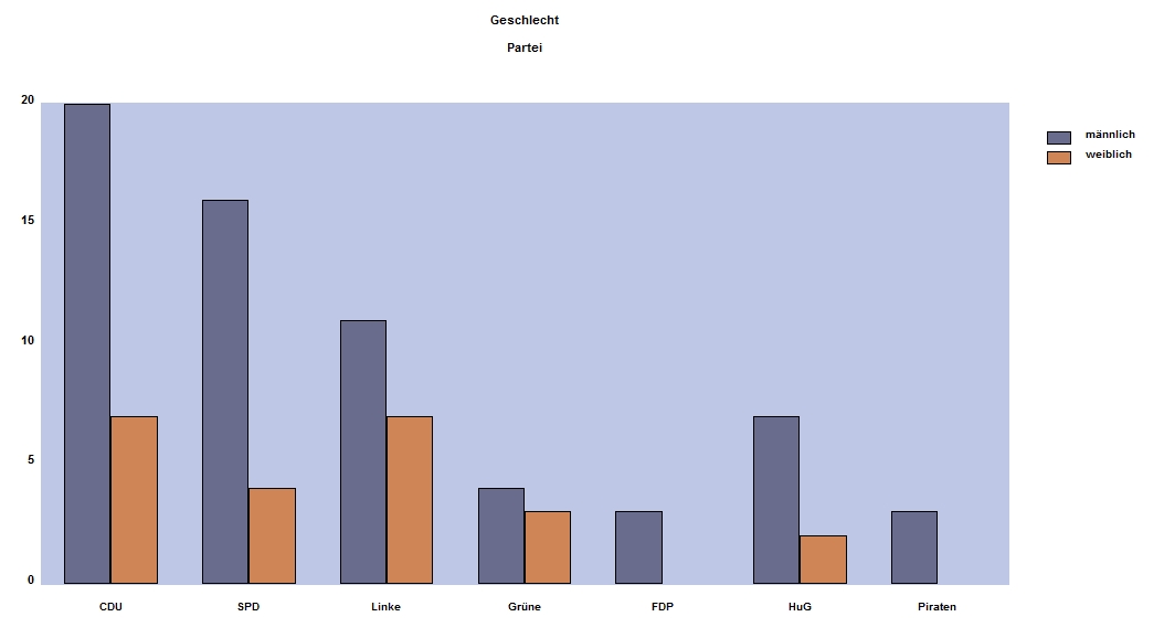 | SPD | 20 | 20,0% | 54,0 Jahre | 25 – 73 Jahre | 60,0 % | 13 |
