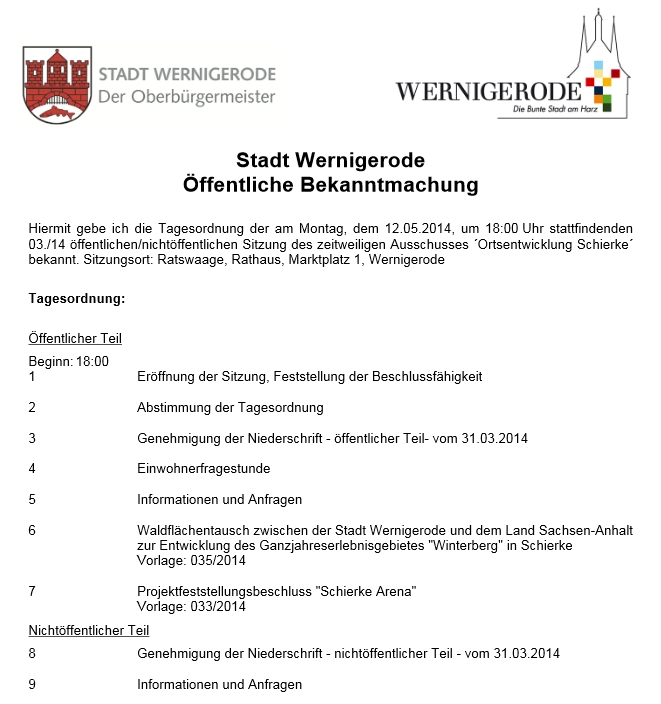 Oberbürgermeister Peter Gaffert eröffnete die Sitzung mit einer Erklärung der Verwaltung zu der am gleichen Tag durch die Volksstimme öffentlich gemachten Sperre der Kommunalaufsicht über 1,6 Millionen Euro im Finanzhaushalt Wernigerodes. Die nach Gafferts Einschätzung übertrieben negative Presseberichterstattung habe dazu geführt, dass in der Verwaltung den ganzen Tag über Anfragen zur finanziellen Situation der Stadt eingegangen seien – bis hin zur Frage, ob der für dieses Jahr in Wernigerode geplante Sachsen-Anhalt-Tag aufgrund der Haushaltssperre ausfallen müsse. Der Oberbürgermeister betonte in diesem Zusammenhang die im Vergleich zu vielen anderen Kommunen hohe finanzielle Leistungsfähigkeit der Stadt und kündigte an, dass die Verwaltung gegen die Haushaltsauflagen der Kommunalaufsicht zeitnah Widerspruch einlegen und notfalls auch vor Gericht ziehen werde, um die aus seiner Sicht ungerechtfertigte Mittelsperre wieder aufheben zu lassen. Die anwesenden Kommunalpolitiker bat er, sich nicht an der vermeintlichen Negativkampagne der Presse gegen die Schierker Ortsentwicklung zu beteiligen. Insbesondere der in der Presse dargestellte direkte Zusammenhang zwischen dem Eisstadion und der Rüge der Kommunalaufsicht sei nur in geringem Umfang gegeben, da im Haushalt für 2014 erst 750.000 Euro für die Planung der Arena enthalten sind, während die Baukosten in Höhe von 6,3 Millionen Euro den Haushalt erst in 2015 und 2016 belasten werden.